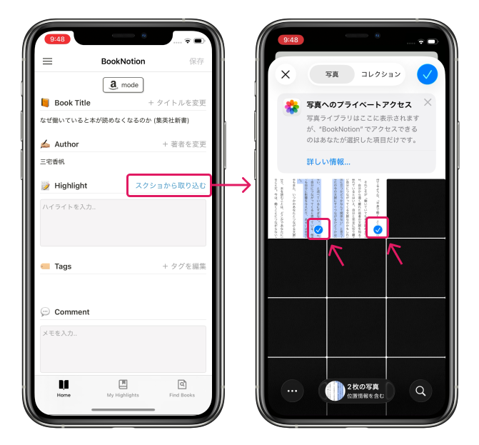 BookNotionアプリの「スクショから取り込む」から、先ほど撮影したスクショを選択すると、ハイライトされた部分が自動でスキャンされて入力されます。